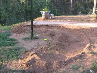 And here is the full view. We used windsor blocks for the cut side and terrace blocks for the fill side. In case you were wondering how I got the circle, I tied a piece of string to the lower part of the hoist, then tied the other end to a piece of steel. You could also use a stick, but I had an odd piece of concrete rebar laying around (thanks to the builders). It was only 15cms long.