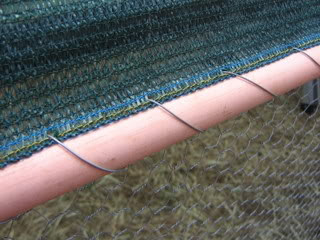 All pipe attachment to the structure was done with wire. Be cautious of the wire ends when attaching the shade cloth however. I had all my wire tie-offs inside the structure, so they wouldn't catch on the cloth as it hung over the top.