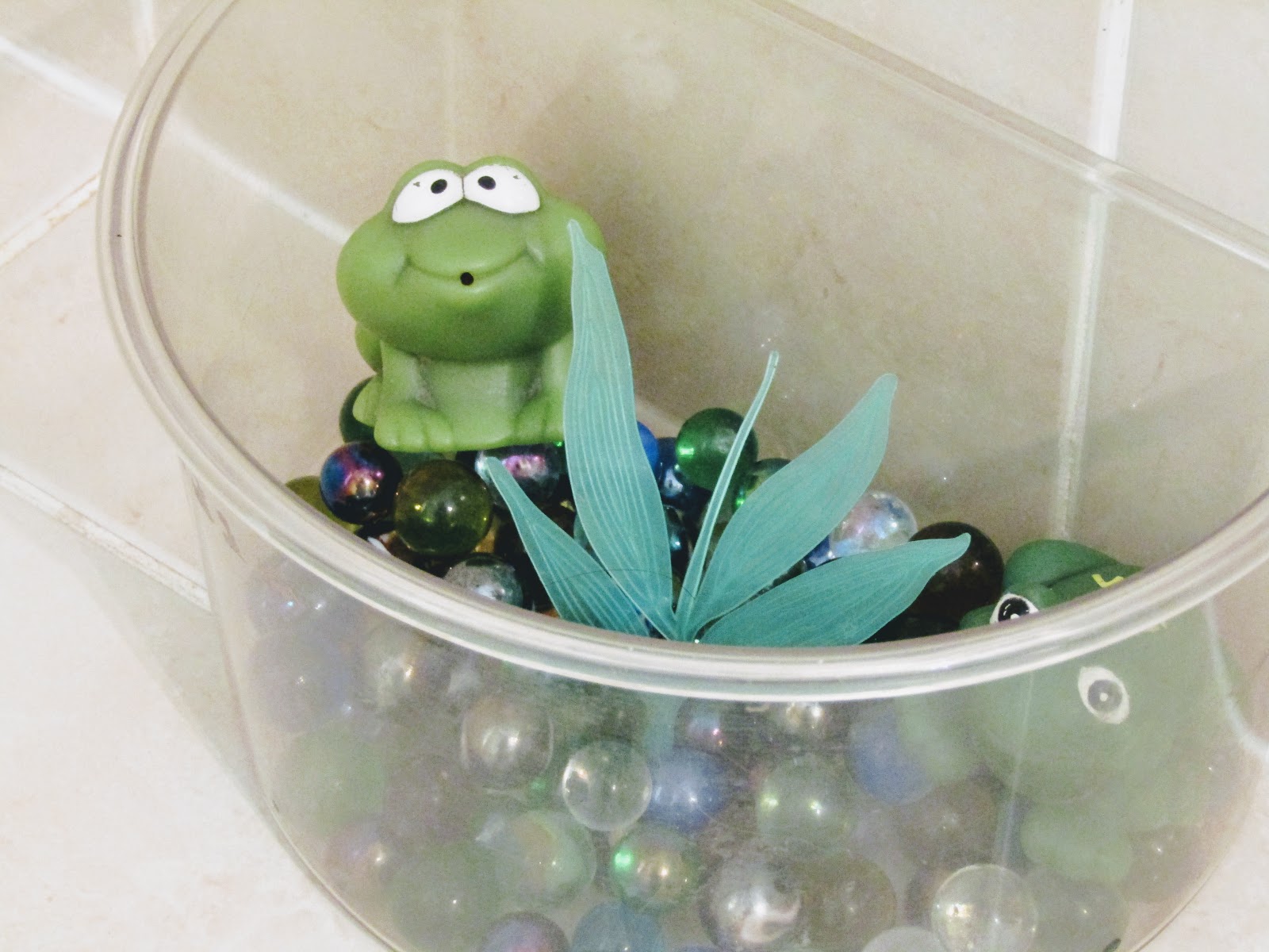 Here's the rest of that marble collection, I was telling you about. More bath time fun. Frogs are from another thrift store rescue, but the plastic plant and container, was part of a mermaid play set, my daughter received from her extended family, many years ago. It's the one item, I dread cleaning the most. All those marbles with soap scum. Are you kidding me?? It requires a lot of patience, lol.